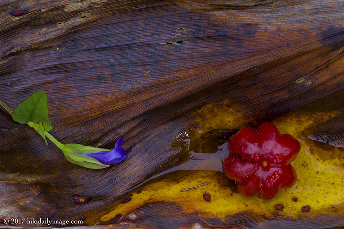 You never know what you're going to find under the Surinam cherry tree. On a fallen ti leaf.