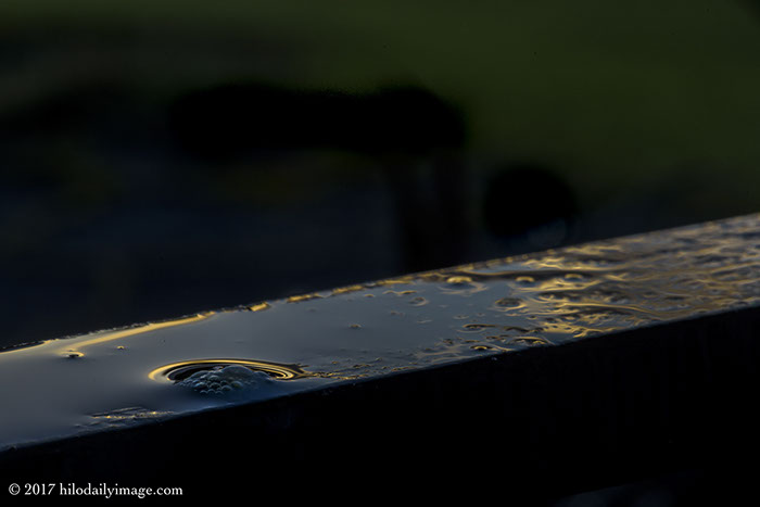 Porch railing, water, rising sun, and what's maybe an insect's doing. I don't know what the mound of bubbles is. But with the sun hitting it and the railing, I liked it.