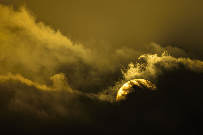 Setting sun, Hilina Pali. I'm not sure what atmospheric phenomenon deckled the sun's rim. It's not the lens, because the wisps of clouds are sharp.