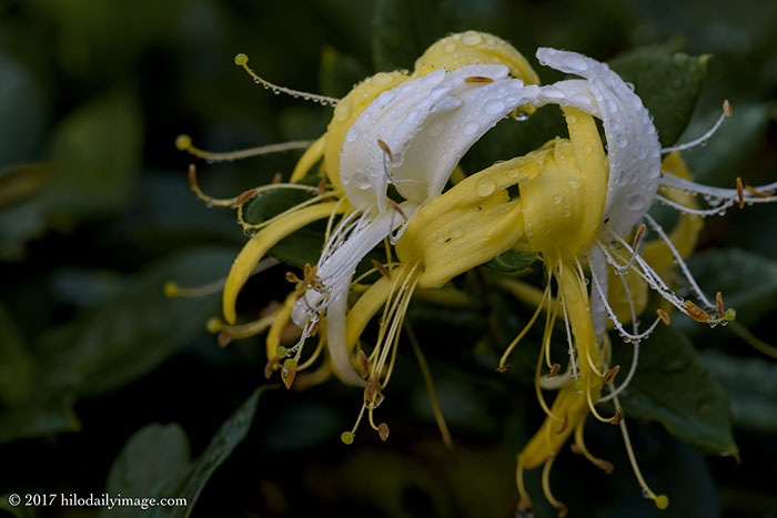 The honeysuckle blossom is a few days old, but the plant is a good 65 years old. Still going strong.