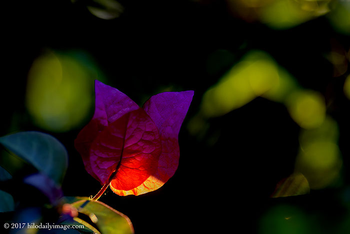 I went down to the driveway to see what might be there, and found the early sun shining through the gardenia bushes and lighting up this Bougainvillea bract. Earlier in the week I lost out on a perfectly-lit shot because I didn't get set up and back outside quickly enough, and the rising sun had moved. This time I did.
