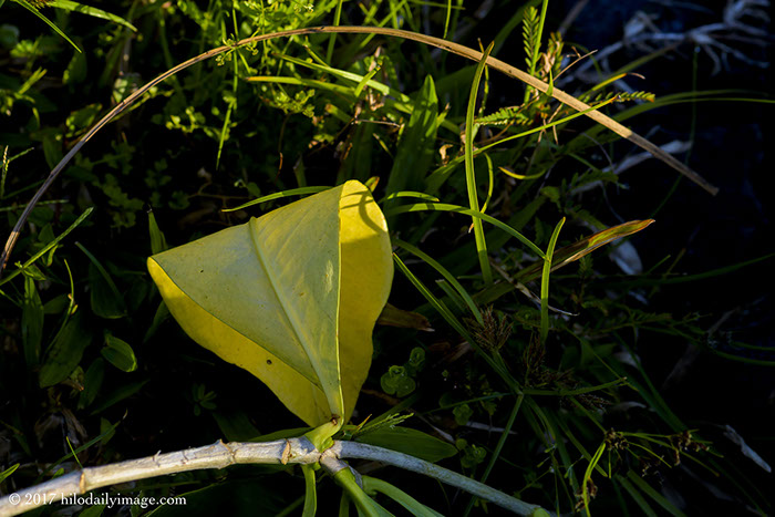 I was doing much-delayed tree trimming yesterday. Here's a pua kenikeni leaf and fell, folded, and caught this morning's light.