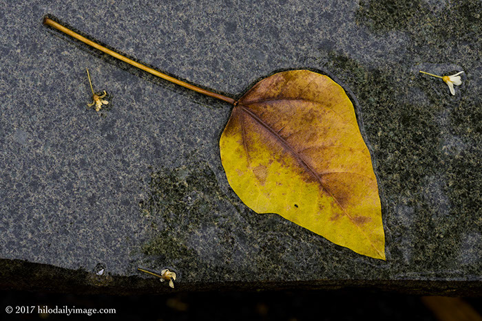 Kukui leaf on the bench. With kukui blossoms. And water.
