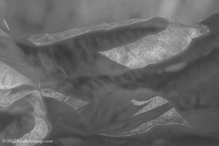 In a black and white low-contrast mood. Breadfruit leaf. The shot had very high contrast (direct sun on the leaf) and that's how I'd envisioned it while shooting, that the shadowed parts would go to black. The fun began when I brought up the shadows.