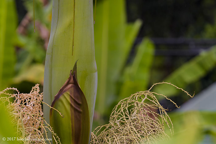 Rainy, dark morning. Here's the smaller Areca palm. I liked the muted colors. Those are banana leaves in the background, brought up close by a long lens.