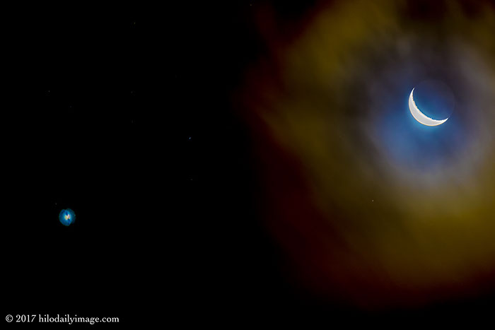 I was up before 4 AM, thanks to a wrong number from PA. Then I saw the crescent moon and Venus. Sometimes I fight what's called "chromatic aberration" and sometimes, as here, I embrace it. It's very rarely a problem with any of my lenses. I don't really know what happened with Venus at the moment I made this shot, but it bloomed into something blue and beautiful. So I kept it.