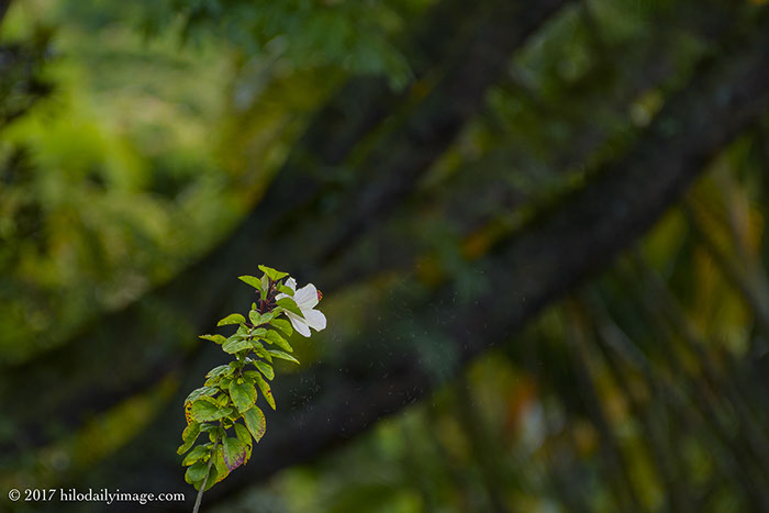 The white hibiscus like light, and will climb to get it. This one is over at the makai border. It's about 25' tall -- single branch. If you look closely, you can see a swarm of some kind of insects around it.