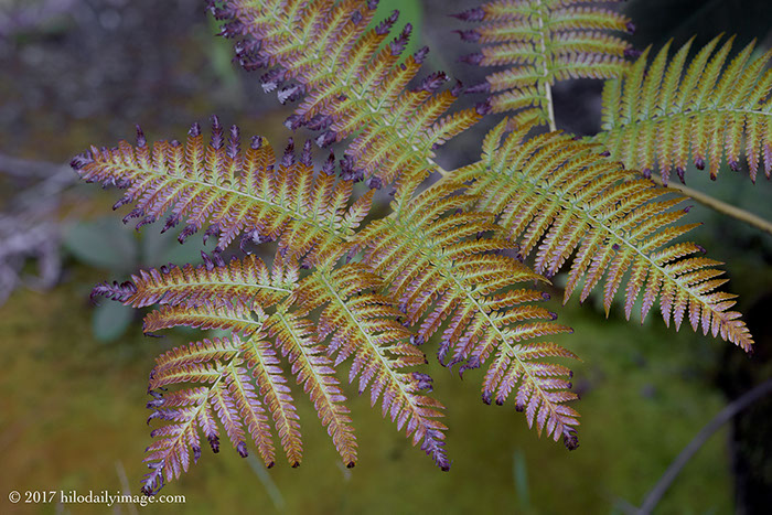 Yesterday's bright and saturated, today muted. I caught this hapu'u frond in a dying state I hadn't seen before. I liked it.