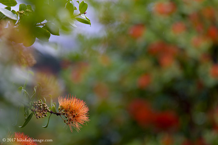 One orange 'ohi'a is not as orange as the others. It will be, but not today.