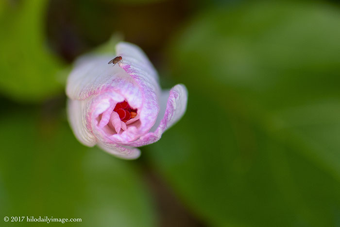 White Hibiscus #5. For this one I focused on the magenta inside -- and the fly flew in and sat in the focus plane. Can't honestly say that I planned this one.