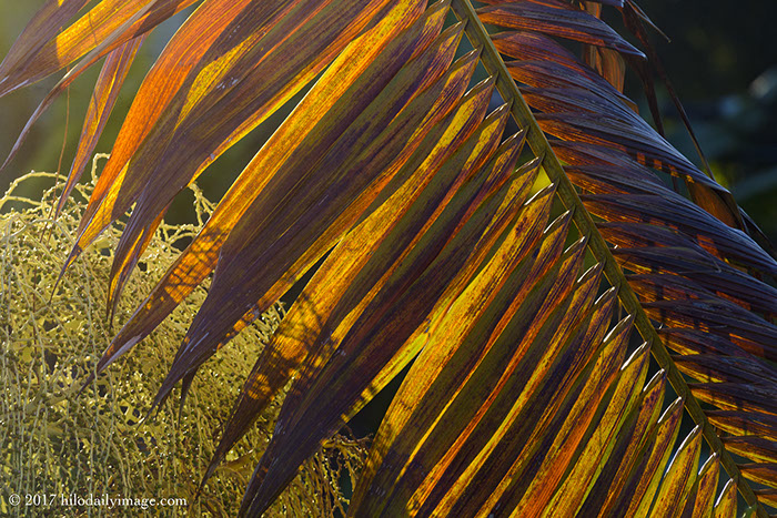 Some nice strong sunlight was lighting up a falling frond -- no, not literally falling. But it's slowly on its way down.