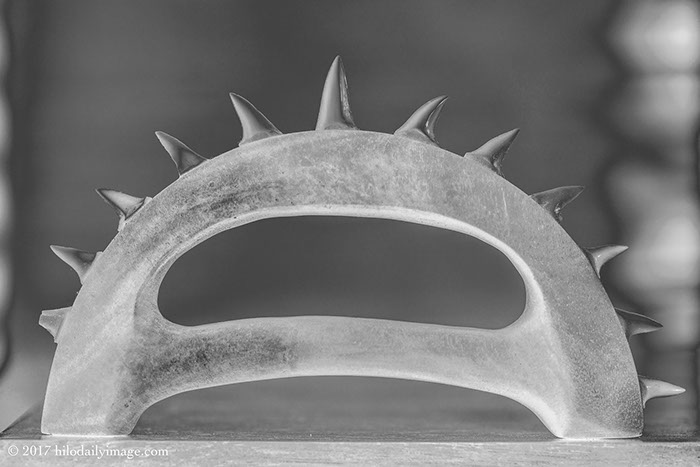 Shark tooth weapon (replica). There was plenty of sun this morning, but I liked the way the light was playing on the koa table in the living room. Also, this weapon's been on my mind for reasons that only three or four people are aware of (OK, it turns up in a non-fiction piece I'm writing and have to finish this weekend). I thought a straight shot would be boring, so here's a manipulated one.