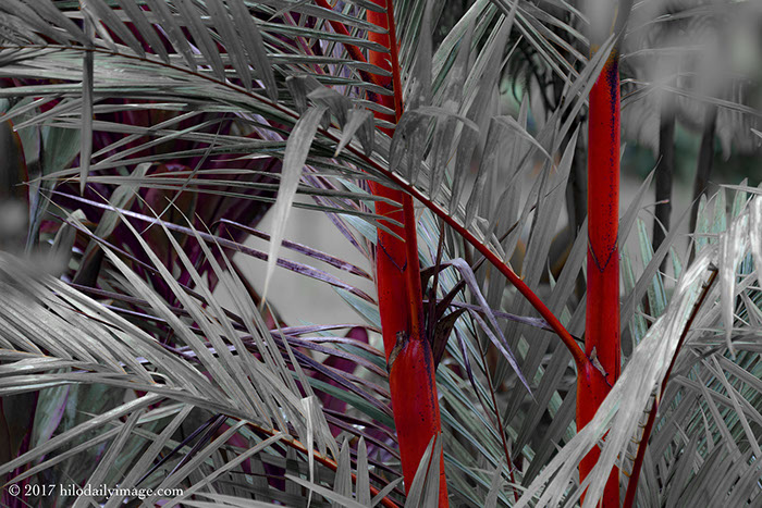 Tom and Maile's "lipstick" palms, redly wet in a light rain. I've done a few HDI images like this, for example the lychee tree from November 20th . The technique is hardly a secret, and it's very simple, provided you have a tool that allows saturation changes by color. All I did here was to desaturate green, which (as is obvious) turned green leaves into gray leaves, while leaving the other colors alone. It worked because there was almost nothing but red and green.