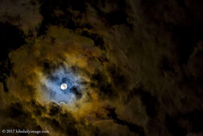 I think that moon shots, like so many common scenes, are difficult. It's hard to find something different to do with them. I was up earlier than usual (4:30 AM) and went outside to see how the super moon was doing this morning (I shot it last night, too; you can find that one on my Instagram feed (#hilodailyimage)). There were colors, though of course I brought them up with processing. So here's an AM super moon, with clouds.