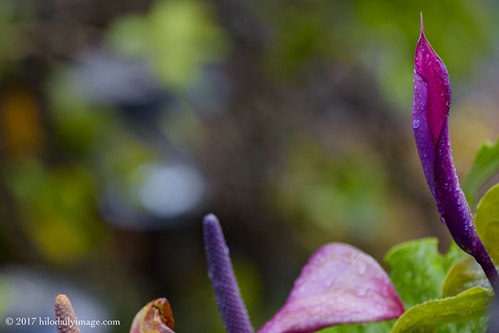 Back to the anthurium bed, not least because it's raining and I can shoot down into it from the porch.