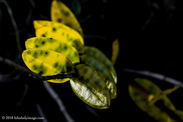 The yellow epidendrum blossoms were looking good this morning, but I liked their leaves better. Here's a spray all stacked up and backlit. I couldn't resist it. I did resist snapping off the part of the stem obscuring the first leaf. It didn't seem fair, just to get a better shot.
