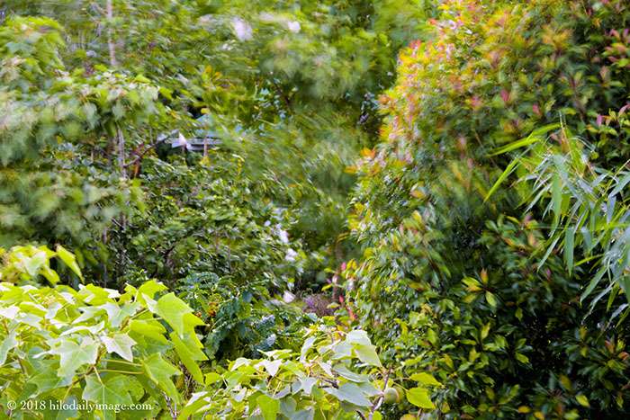 When I went out to see what I could see, I was struck by the number of trees between the front porch and the back border. After I cleaned up the back border, in 2009, the view from the porch was entirely the house you can see traces of here. Now, we have (from near to far) kukui #1, bamboo, cloves, coffee (the focus point) kukui #2, white hibiscus, monkeypod, and kukui #3. It was windy so I kept waiting for the wind to swirl the leaves.