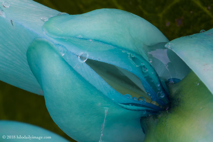Another low-light morning. I thought it was time to try getting the exposure right for that part where the dark blue meets the green/yellow. But in this shot, I didn't succeed. I'll try again sometime. Another interesting difficulty was a drop of water on the underside of the opening, on the upper left.