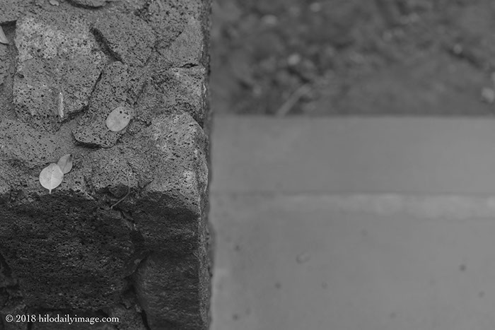'Ohi'a leaves, rock wall, steps, and worm. Yes, there's a worm there. I don't know what it was doing on the wall.