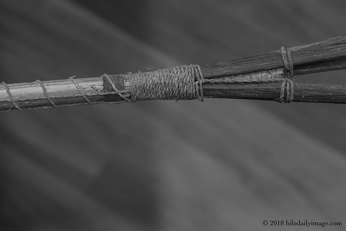 I needed an early shot, so here's an inside one. Nagovisi (Bougainville) arrow, of the type known as katei. Detail, of course, because the lashing is very fine. This was made in 1969.