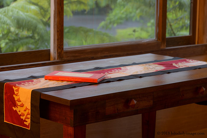 I had to make the HDI early. Here's an antique koa table, a runner given by one friend, and a book given by another. And the outside, too. Where it's raining.