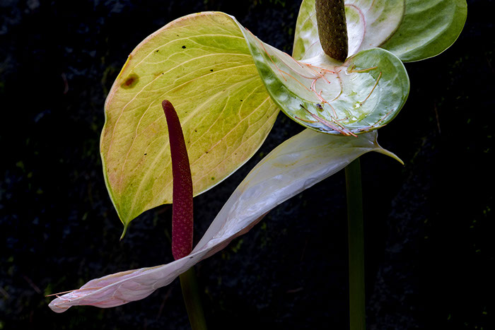 I was looking for orange 'ohi'a strands on the anthuriums, and I found some -- but the shapes and shadows here caught my eye, and I liked the way the early light was passing through the anthurium in the background. Even so, there are some strands here and there.