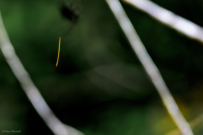 'Ohi'a thread on a spider web thread, blowing in the wind. The light was wrong for catching the spiderweb, but I managed the thread. I had to do what I had to do to get the shutter speed up, and thus the image is a little noisy. This is a severe crop.