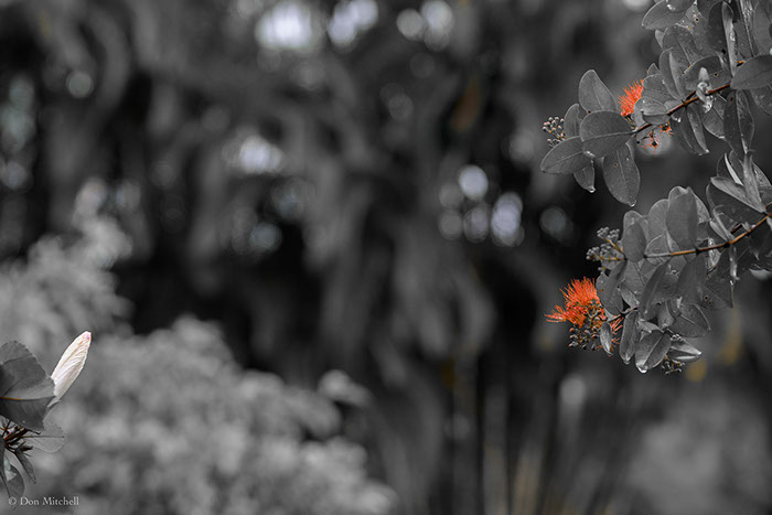 Today I begin the fifth year of the Hilo Daily Image. I'm not sure what to think about that, except it's been a fine ride. Will I go for six years? Can't say. I'd like to. Today I give you White Hibiscus saying Good Morning to 'Ohi'a Lehua.