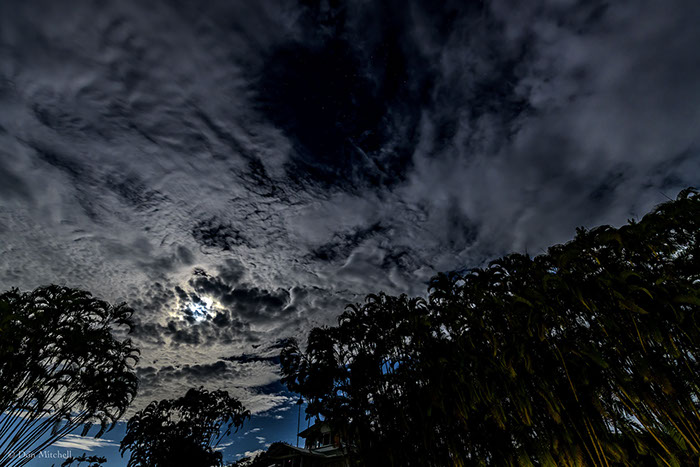 I was up a little earlier than usual (4:30 AM) and saw that the moon was setting among interesting clouds. I shot for a while with a telephoto but soon realized this was a job for the superwide, because the moon itself was the least interesting thing out there. Up there.
