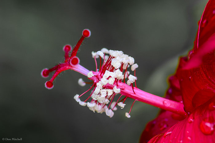 Yesterday afternoon this red hibiscus was a bud, and I thought a lone vertical bud would make a good HDI. But when I went out this morning to look at it, it had bloomed. Well, all right then -- make a different kind of image.