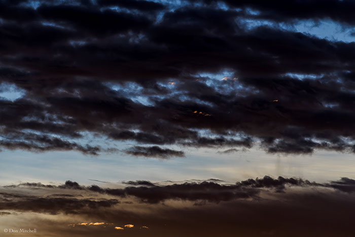 An unusual sunrise this morning. I liked the small color splashes, but also the way the distant clouds near the bottom made a sumi-e effect, as if there were a mountain out there in the Pacific.