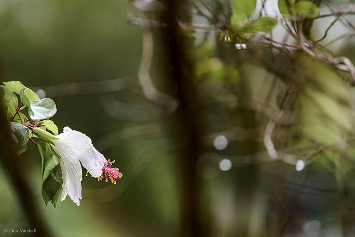 Raining. Here's a white hibiscus in its visually-busy bush.