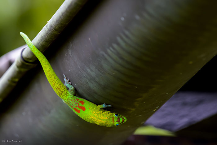 I was shooting from the back lanai and had an OK shot, but then I looked up and over and there was a gecko on the gutter. So why not have an animal instead of all those boring plants?