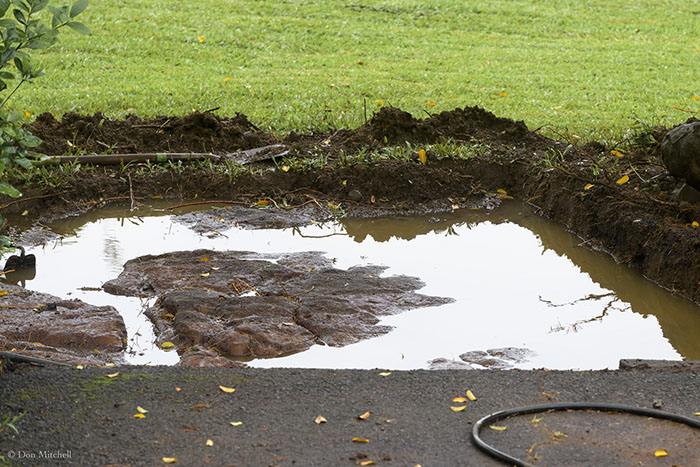 This area was filled with mature gardenias. I dug them out, gave them away, and am turning the area into a gravel pad so that the people who continually complain about having to back out a long unlit driveway at night will stop complaining. Plus, though difficult, it's an interesting project. The lava was just below the surface (I knew that) so it was a matter of stripping off the dirt (which a neighbor hauled away for his yard) to get down to the lava. I want as much dirt as possible out of there, so that nothing will grow up and through the gravel.