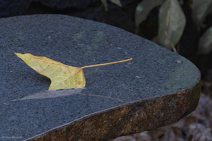 Kukui leaf on the granite bench. Water.