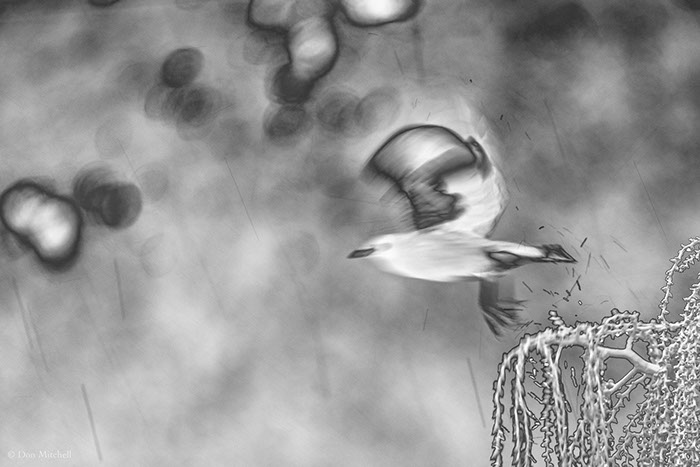 Nasty morning up here (cold, rain, wind). Hereʻs a heavily-manipulated image of a mynah taking off, spraying water.