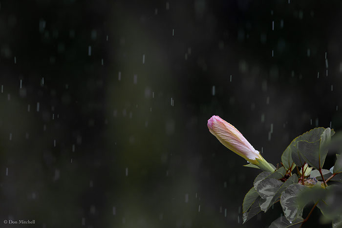 Rain. White hibiscus, more magenta and yellow than white. Leaves, desaturated.