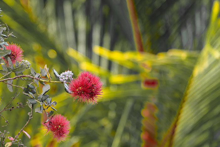 I rarely shoot the red 'ōhi'a that's up along the mauka border. But this morning it had some fine blossoms, and I liked the red of the lipstick palms in the background.