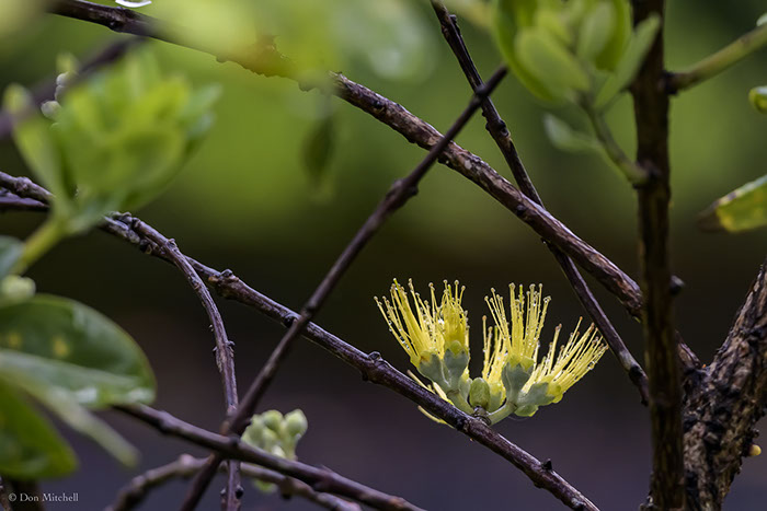 On a wet but rain-free morning I shot the first new blossom the Jane Britton 'Ōhi'a has put out since I moved it down the hill from its original home. The ground was too soggy up there; it's better-drained where it is now.