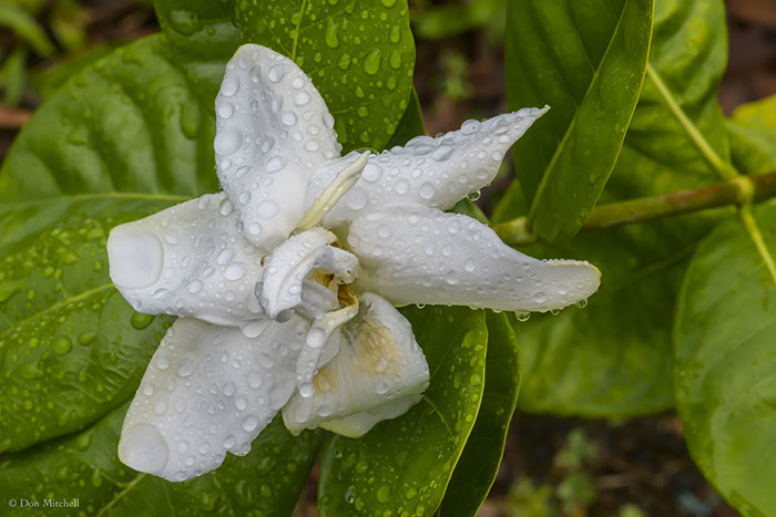 Rachel's gardenia has opened even more, light rain and all.