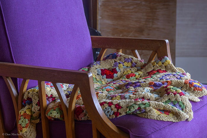 Chair and old afgan. Note: the HDI may start running late in the day. I'm not going to be so fixed on making the shot and getting it up before mid-morning.