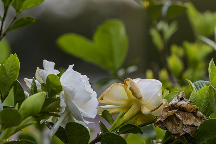 I noticed that in one frame I could capture the complete gardenia life sequence. L to R: bud, full blossom, getting old, gone. Well, not literally gone. But you know what I mean.