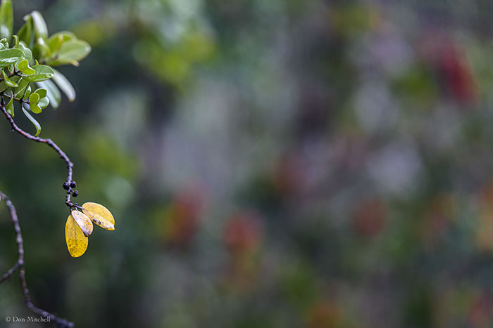 Some old leaves on the orange 'ōhi'a, in the rain.