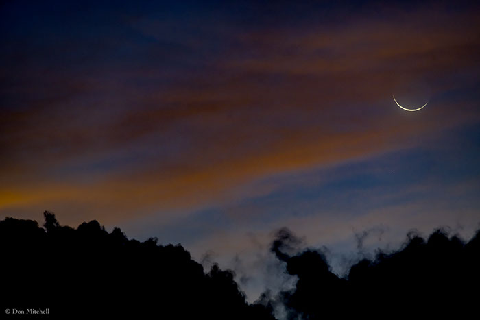 An interesting crescent moon, with sunrise and clouds. This was about 5 AM.