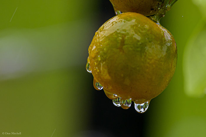 Small lemon on the back lanai, with railings in the waterdrops.