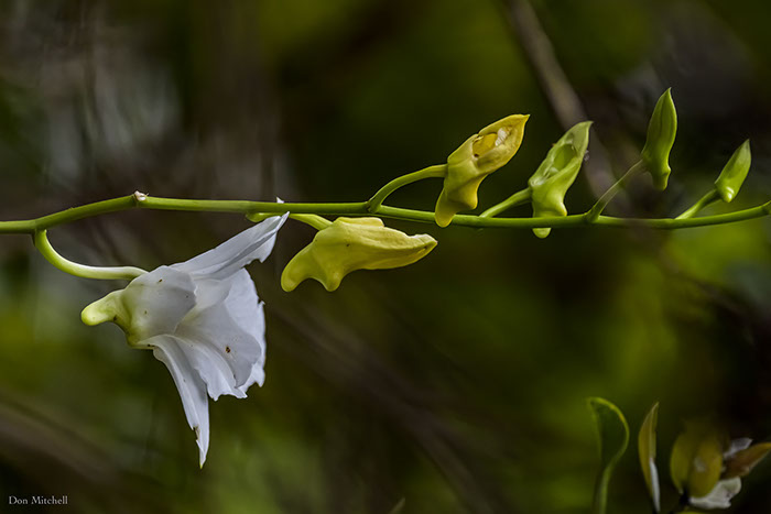 Long ago I put an orchid in one of the yellow 'ōhi'a, and recently it decided to blossom. I like the progression left to right.