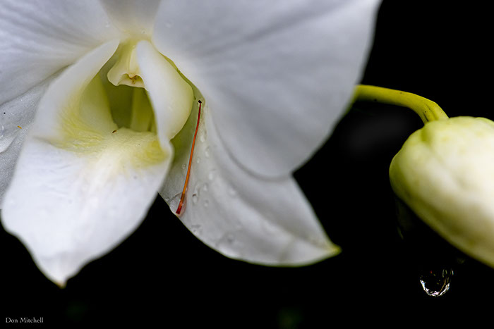 I put an orchid in one of the orange 'ōhi'a, and it bloomed. I was going to shoot the orchid as an orchid but then I saw that one of the 'ōhi'a stamens had fallen into it.