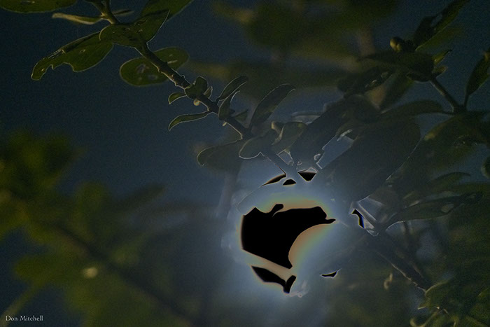 Bright full moon before dawn. I caught it in the Jane Britton 'Ōhi'a's branches. Then I applied this and that and the other thing, to get this image.