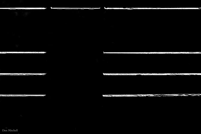 The porch railings are black, and I've been noticing that when the sunrise is just right, the horizontals are highlighted but the verticals are not. So this morning I thought I'd work with that. You can see the little upticks of white on the right side of the otherwise invisible verticals.