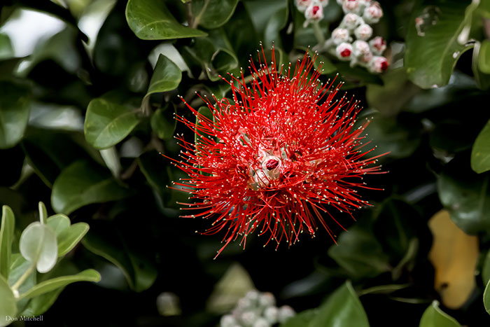 The Becky Cooper 'Ōhi'a is also making blossoms. I noticed one hidden in a dark pocket of leaves.
